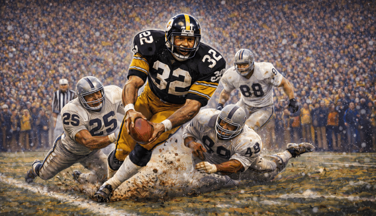 With 22 seconds left, Terry Bradshaw, on his own 40-yard line, threw a desperation pass that was deflected after a violent collision between the Steelers Frenchy Fuqua and  the Raiders Jack Tatum.  Before the football hit the ground, Franco Harris made a miraculous catch at shoe-top level and raced 40 yards into the end zone for the game-winning touchdown – known ever after as the Immaculate Reception.